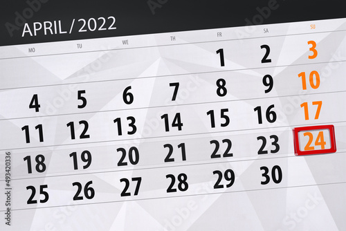 © aleksandrbs, Fototapeta premium Calendar planner for the month april 2022, deadline day, 24, sunday