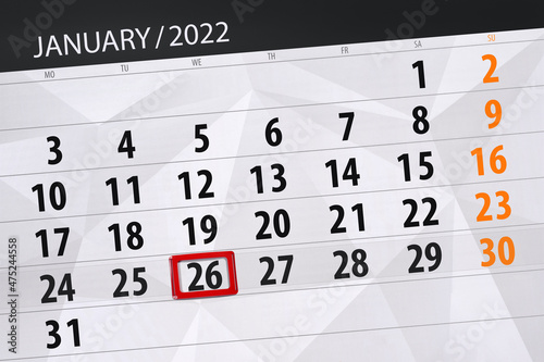 © aleksandrbs, Obraz premium Calendar planner for the month january 2022, deadline day, 26, wednesday