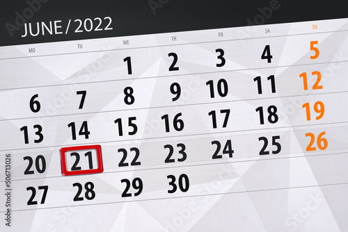Fototapeta premium Calendar planner for the month june 2022, deadline day, 21, tuesday
