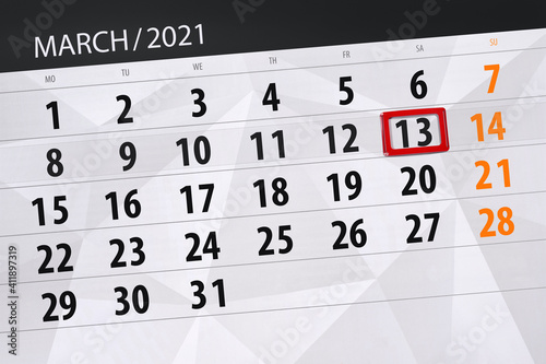 © aleksandrbs, Obraz premium Calendar planner for the month march 2021, deadline day, 13, saturday.