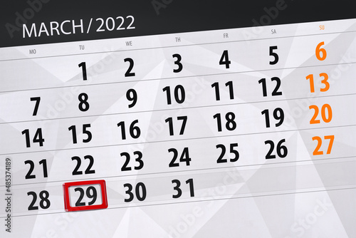 © aleksandrbs, Obraz premium Calendar planner for the month march 2022, deadline day, 29, tuesday