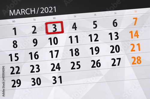 © aleksandrbs, Obraz premium Calendar planner for the month march 2021, deadline day, 3, wednesday.