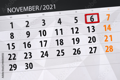 © aleksandrbs, Obraz premium Calendar planner for the month november 2021, deadline day, 6, saturday