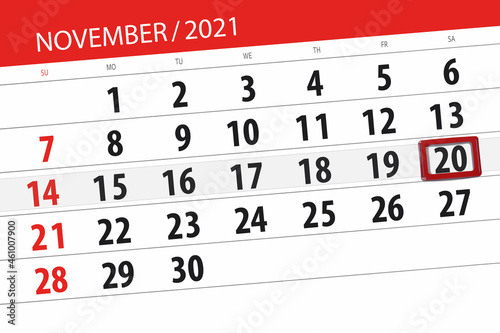 © aleksandrbs, Obraz premium Calendar planner for the month november 2021, deadline day, 20, saturday