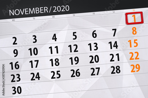 © aleksandrbs, Obraz premium Calendar planner for the month november 2020, deadline day, 1, sunday