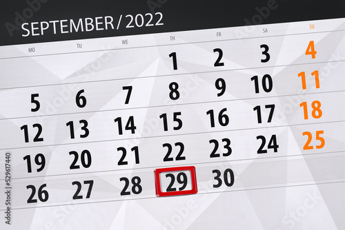 © aleksandrbs, Obraz premium Calendar planner for the month september 2022, deadline day, 29, thursday