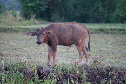 Fototapeta premium Calf buffalo looking grass around field.