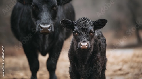 © Thares2020, Fototapeta premium Calf standing next to its mother cow in a natural setting