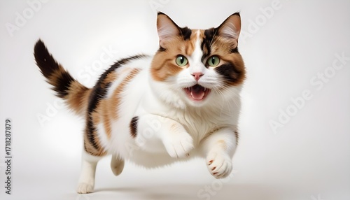 Obraz premium Calico cat leaping with a wide open mouth against a clean white background.