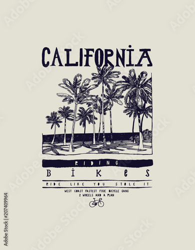 © Handdraw, Obraz premium california bikes palm beach t-shirt - tropical vintage typography print