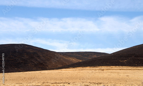 © sheilaf2002, Fototapeta premium California drought parched brown fields with fire scorched hills in the background. Blue cloudy sky.