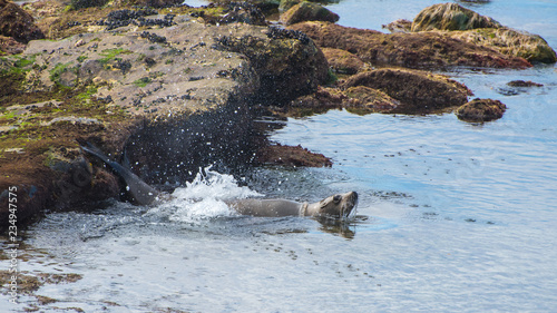 © Evelyn, Fototapeta premium California Sea Lion plunges into the Pacific from a Rocky Ledge