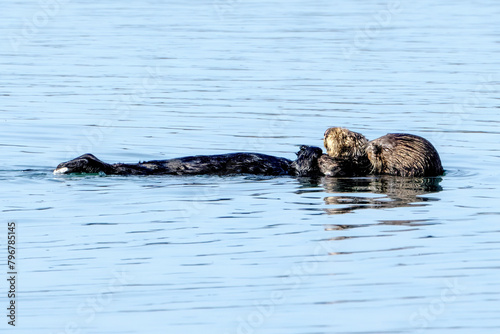 Fototapeta premium California sea otter mama and baby swimming