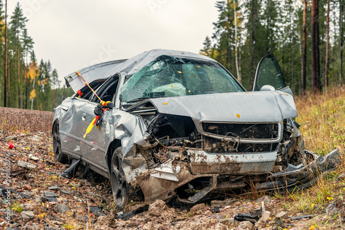 © Magnus, Fototapeta premium Całkowicie zdemolowany przedni samochód w kolorze srebrnym