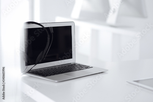 Fototapeta premium Call center and communication support, customer service help desk. VOIP headset on laptop computer