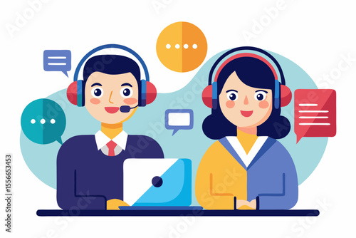 © Ranti, Obraz premium Call center. Help, Support and Contact. Customer Service Icon. Male and female call center working in headphones. Customer service character.