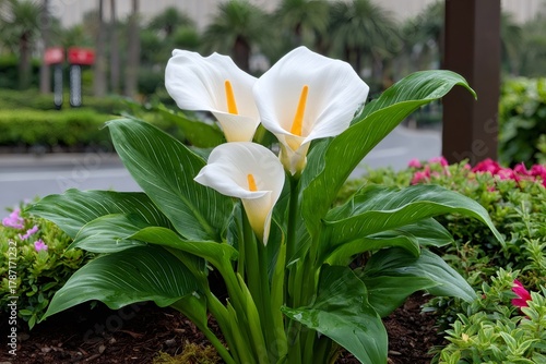 Fototapeta premium Calla lily flowers blooming in green garden bed