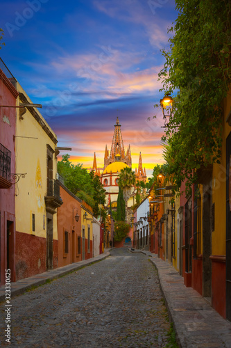 © Argelis, Fototapeta premium Calle Aldama Parroquia Archangel iglesia Dome Steeple San Miguel de Allende, México. Parroaguia creada en los años 1600.