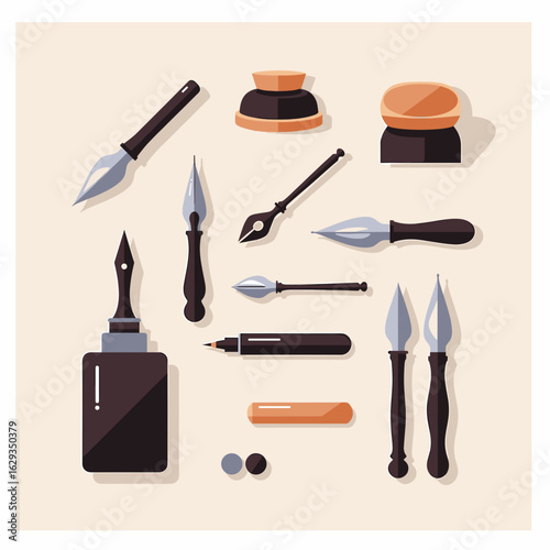 © Roman Stock studio, Obraz premium Calligraphy tools and accessories in flat style on light background