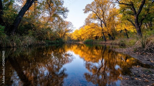 Fototapeta premium Calm autumn river reflecting golden trees. Peaceful nature scene. Use...