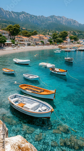 © Lala Farikha, Obraz premium Calm bay with small boats moored near a picturesque coastal village under a clear blue sky.