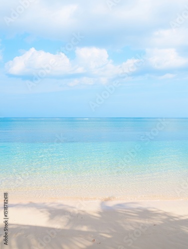 © sunny, Fototapeta premium Calm beach scene with clear turquoise water, soft sandy shore, light cloud-filled sky, and gentle shadows from nearby palm trees, evoking peace and relaxation
