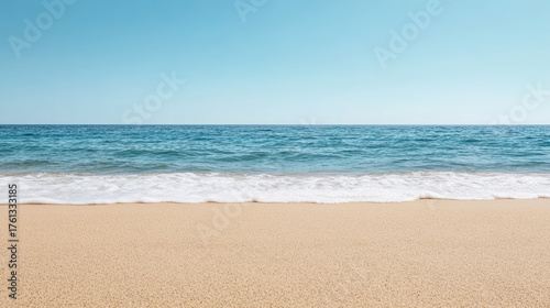 © siraphol, Obraz premium Calm beach scene with soft horizon, clear blue sky, and gentle waves lapping at shore