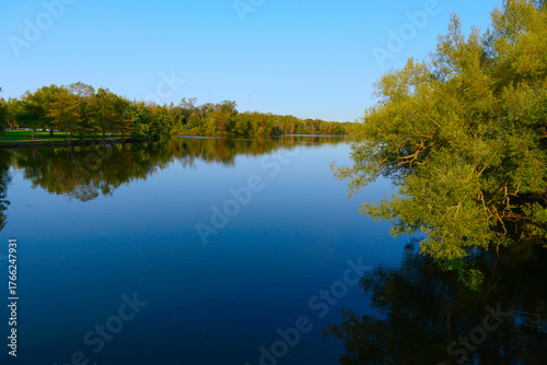 Fototapeta premium Calm blue lake reflects trees