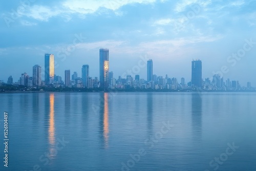 © btiger, Obraz premium Calm city skyline at dawn with tall buildings reflecting golden sunlight on smooth water under a cloudy blue sky