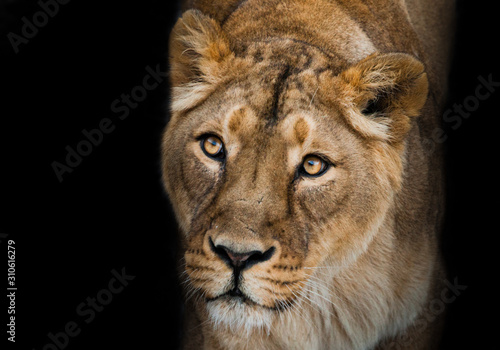 Fototapeta premium Calm confidence snow background. predatory interest of big cat portrait of a muzzle of a curious peppy lioness close-up