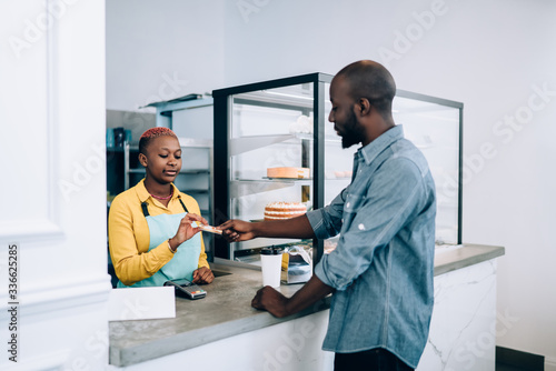 © BullRun, Obraz premium Calm ethnic employee taking client electronic card for order payment in cafe
