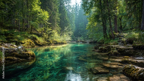 Obraz premium Calm forest beside a clear river, highlighting natural preservation and...