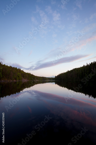 © Juhku, Fototapeta premium Calm forest lake at midsummer night sky reflection