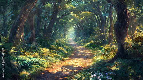 Obraz premium Calm forest path leading into the distance surrounded by tall trees and dappled sunlight creating a magical atmosphere