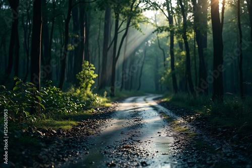 Obraz premium Calm forest scene with a curving path, natural greenery, and sunlight peeking...