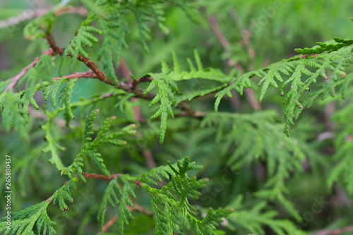 Obraz premium Calm green plant background. Thuja, fern, soft focus, closeup.