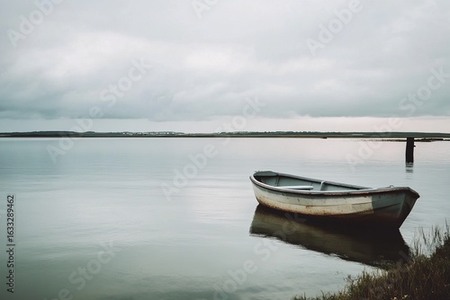 Naklejka premium Calm, grey lake with a small, weathered boat