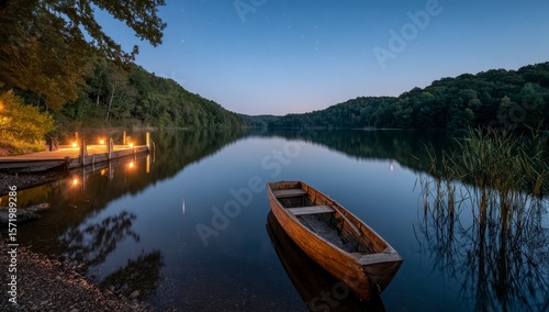 © Muhammad, Fototapeta premium Calm lake at twilight, illuminated dock