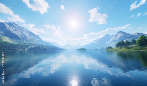 © Sepatu, Naklejka premium Calm lake reflecting mountains, sunny sky, idyllic scenery