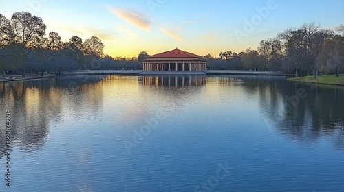 © Bebek, Fototapeta premium Calm lake reflecting sunset over pavilion.