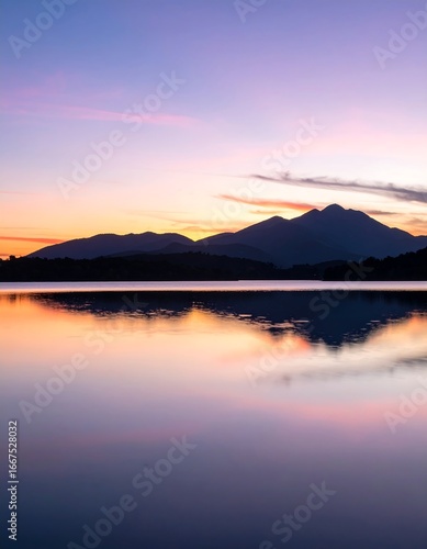 © Ayem, Fototapeta premium Calm lake reflects colorful sunset over mountains