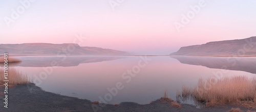 Fototapeta premium Calm lake sunrise, misty mountains reflecting, peaceful landscape