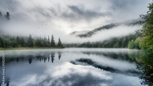 © Atizaz , Fototapeta premium Calm lake surrounded by fog with reflections of distant trees and mountains creating a dreamlike scene
