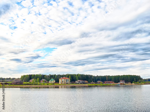© keleny, Fototapeta premium Calm lake view with colorful houses amid lush green trees under a cloudy sky in a serene rural setting