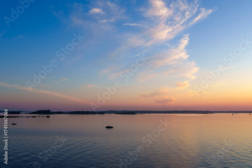 © Tommy, Naklejka premium Calm lake with distant forest and pastel sky at sunset