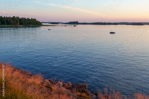 Fototapeta premium Calm lake with islands and pastel sky at sunset