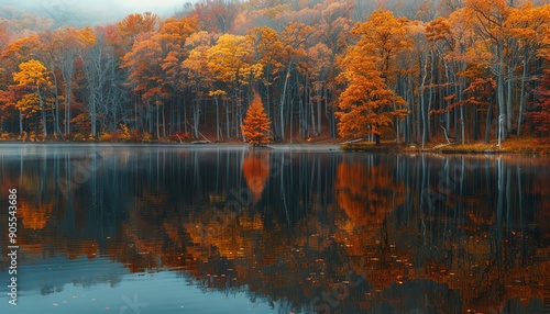 Naklejka premium Calm lake with reflections of autumn trees, fall tranquility, serene landscape