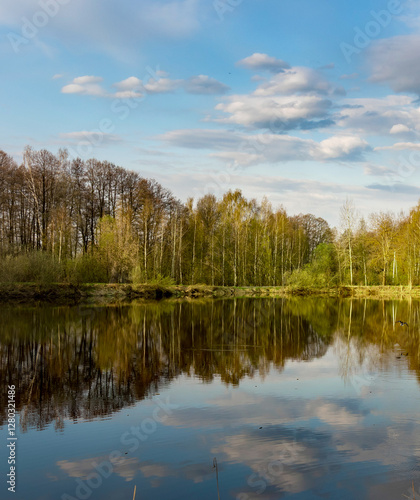 © Sergei, Fototapeta premium Calm lake with trees in the background