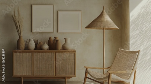 Obraz premium Calm living room, rattan furniture, sunlit wall, pottery display, interior design
