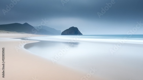 © AbstractAI, Fototapeta premium Calm long exposure seascape featuring a solitary sea stack and serene beach under a moody sky with gentle waves.